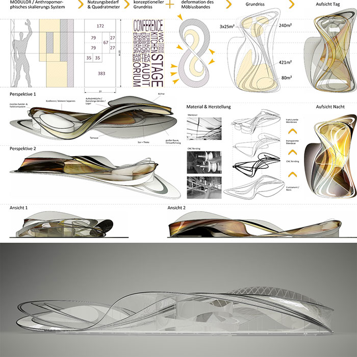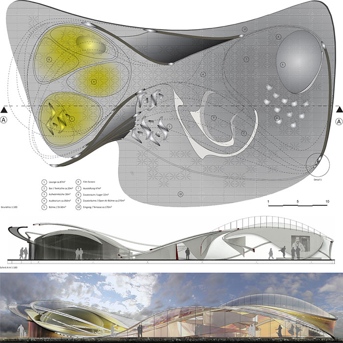 Urban environment: Since it is not yet clarified, where the Pavilion will be constructed, consciously an organic sketch was selected, which can react by its entrances to different urban scenarios, without acting as a disturbing foreign body. Supplementing also the flowing transition between interior and exterior space through terraces