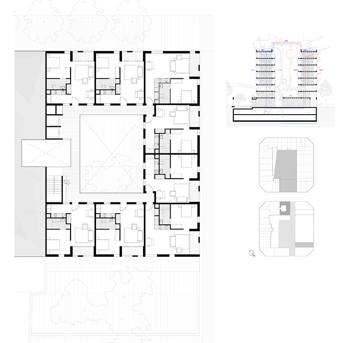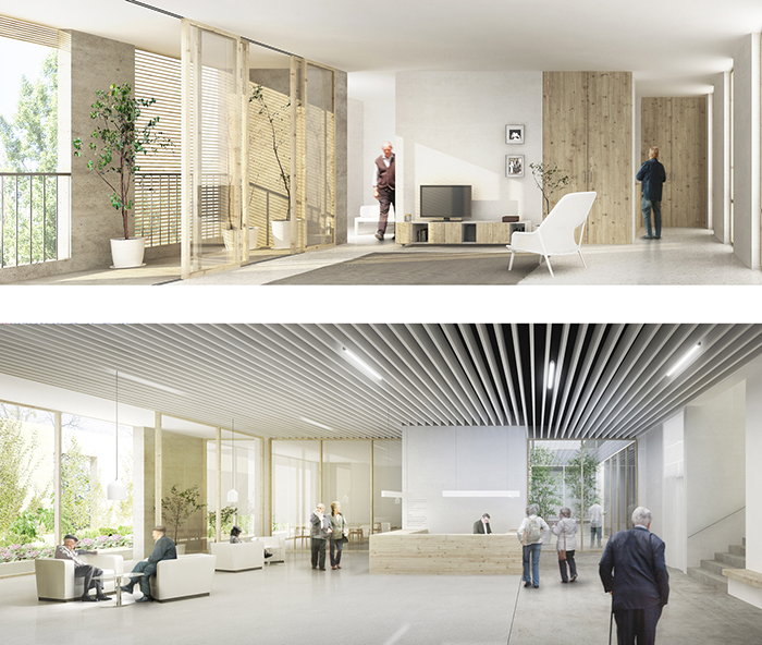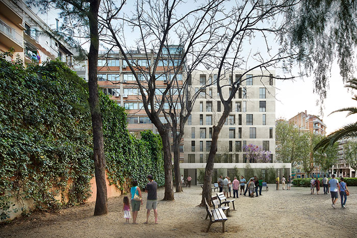 A building with a central covered courtyard is proposed as intermediate protected space, for lighting and ventilation, which gives access to the apartments and organizes the Day Center for the elderly. The clear turning over willingness of the building with 3 facades and its location as the finishing of a built-up crown of this singular urban block is reinforced with facades of unitary character both in their different orientations and programmatic diversity at different levels. Relationships between solid and void, horizontal and vertical, light and shade, give the facade rhythm and domestic character. The building is clearly based on the ground and aligns with the adjacent building to finishing this half open urban block of the Eixample in Barcelona. The proposal is aiming for a passive design using conventional systems and taking full advantage of the local climate, such as a covered semi-conditioned central courtyard with vegetation, cross ventilation for homes with covered terraces and excellent façade insulation.