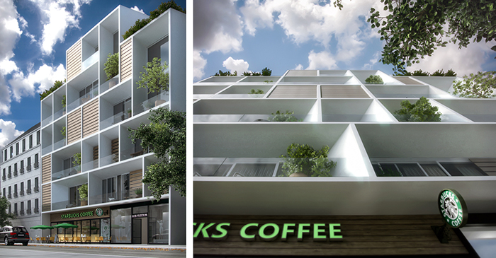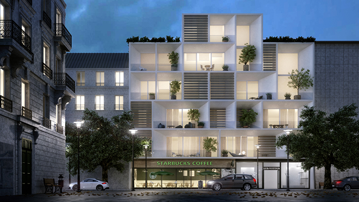 The block (1,944sqm) is conceived as a puzzle of different apartments and mezzanines that extends from 1st to the 5th floor. Spaces on the ground floor level are provided for commercial use. The top floor will become a penthouse with roof-garden. Each facade is a 3-dimensional window that catches the daylight, optimizing the privacy of the different apartments, while creating a unique and sculptural facade. The white coated precast concrete panels determine the appearance of both the interior and the exterior of the building. Optional external shading systems can ensure good indoor temperatures during the summer.