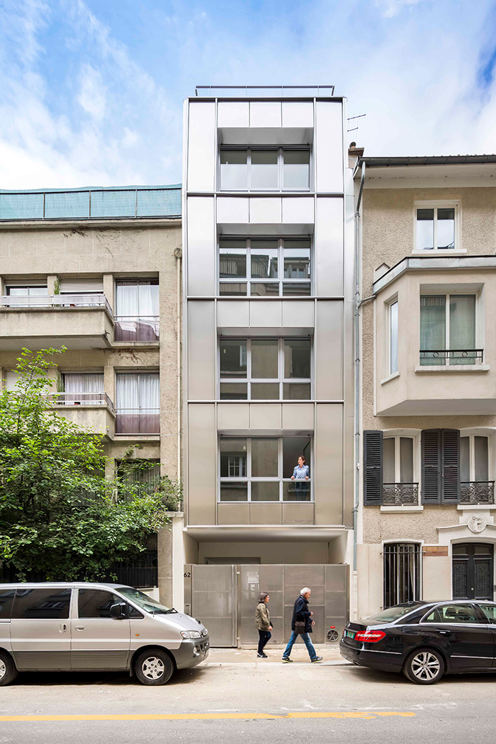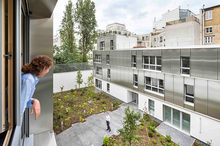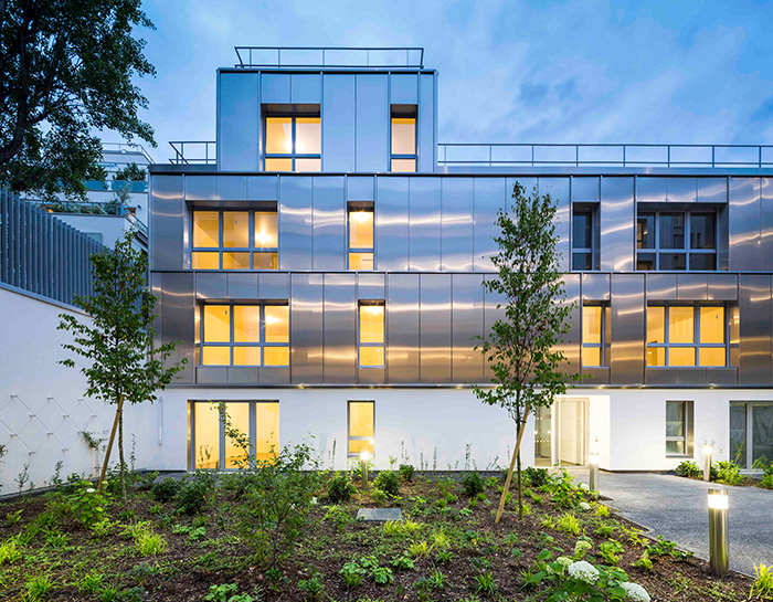 The project corresponds to an urban development strategy promoting continuity with existing buildings. Two buildings contain the programme: one 4-storey building overlooking the road houses seventeen living units while the other building, located at the back of the plot, houses eight more. The first building opens on to Rue Nicolo through an off-ground frontage providing a passageway to the building’s core and access to upper floors. Through this porch, the line of sight is directed towards the central garden. The garden extends the adjacent green spaces to create a green lung at the core of the block. The project is organised around this exterior circulation, which serves the entire programme in a direct and visible way, echoing Parisian passageways. It brings built volumes, central garden and inner courtyards together in a regular, well balanced rhythm. The housing units are dual aspect, with living rooms on the main façade to provide a view and exposure to sunlight. Each unit opens on to a garden with a special theme: golden foliage, shade foliage, white garden, etc. The ground floor and facades around the courtyard have a mineral finish featuring plaster of Paris or white concrete rendering. The main frontage is clad in brushed steel arranged in a regular pattern. On Rue Nicolo, the consistent superposition of windows and extruded elements gives an impression of verticality and airiness. On the central garden, the split levels are suggestive of a shifting of storeys and echo the garden’s landscaping.