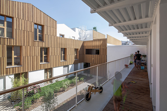 A posteriori the youngest inhabitants make a play area and the inhabitants can arrive in front of their accommodation with their own bike. The widths of the corridors are not strictly limited to the regulation but exceed 180 cm in order to offer common terraces in addition to the privative extensions of the houses acquired.