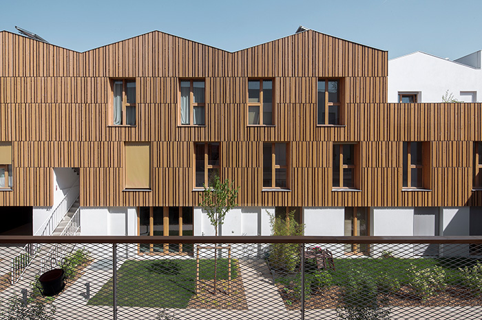 The stacked houses as well as the loggia parts and the terraces / balconies guardrails are covered in wooden cladding. They have sloping roofs reminiscent of the roofs of the district.