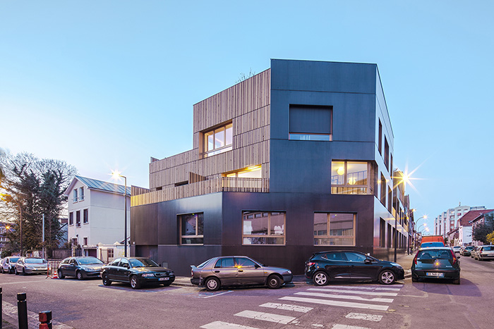The façade on the street consists of a concrete base with a gray shade, on which are superimposed houses (one story or two) clad in light-colored wood cladding. The black pedestal has a varied shape on Desiré Charton Street, which gives a graphic effect to the façade.