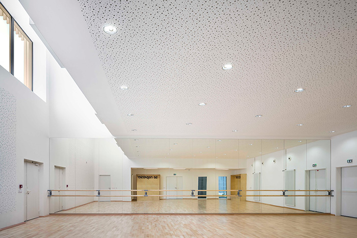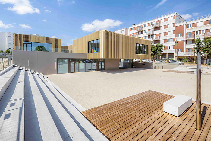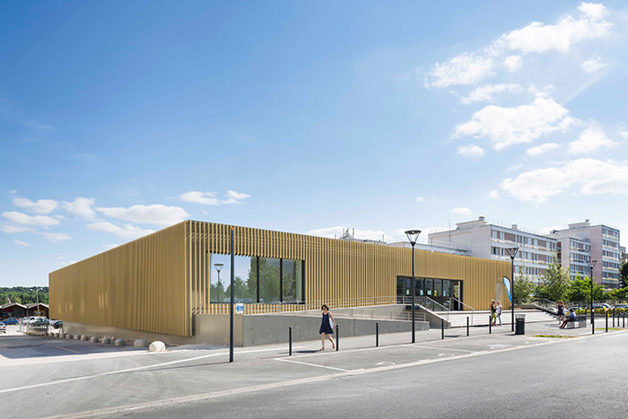 As part of its urban renewal plan, the City of Nemours needed a social centre and cultural space on the wide esplanade of the Mont Saint-Martin quarter. The aim of bringing facilities of this scale together with shops around a redesigned public area was to breathe new life into local businesses and strengthen social ties. Its central, high-profile position bolsters the building’s function as a public asset. Visible from all sides, the project is at the confluence of rue de Chérelles, two side streets and the future cultural centre’s esplanade. The building’s purpose is also to link the upper level of the esplanade to the parking lot base level. The two superimposed programmes conform to the same architectural principles: lobbies offering a clear view from the public space to the interior garden, and organisation of the different hubs around a central patio. Transparency through to the patio and the exterior underpins the project’s configuration and visually links the two programmes. The patio gives the building a sense of interiority, providing views and light to all rooms in the programme as a complement to the exterior frontage. An ornamental garden is visible from the public area through the lobbies of the cultural and social centres. In a highly mineral environment, this is a valuable, refreshing space designed to benefit the users of the public facilities.