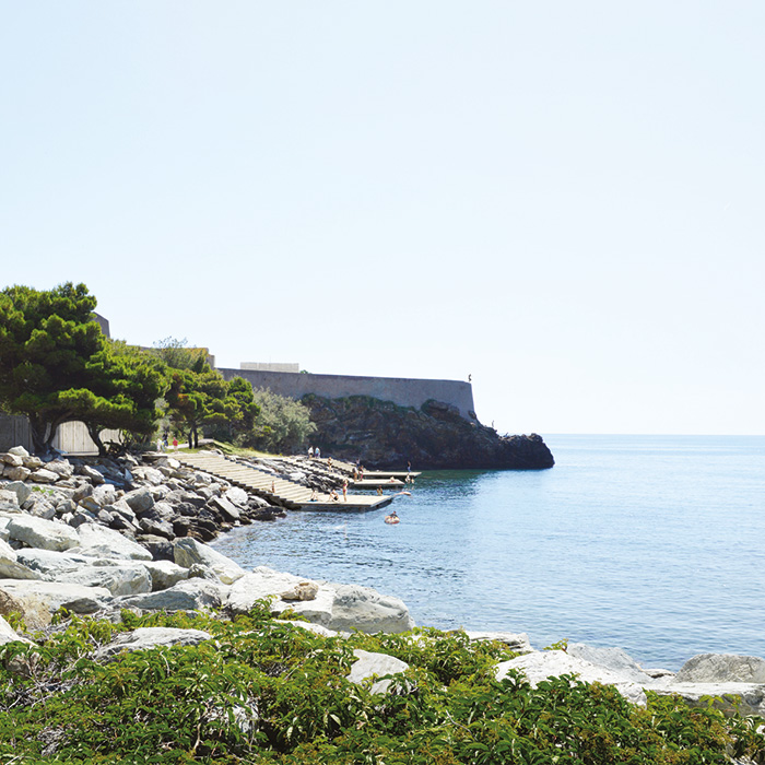 The project does not create new spaces but instead, makes existing ones available. Rocks become accessible as solariums or rocky beaches.