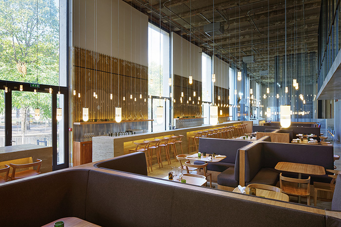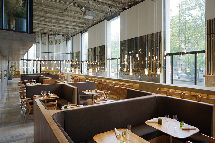 Space 2 “Les Grands Verres”. Act two: Back to earth The Master piece of the place: an 18 meters long bar underlines the central area of the restaurant, made entirely of rammed earth, a 100% natural and sustainable material. A first for Paris. This bar is the genuine “magnet of people.” Thanks to its lively active and sensual materiality, it is the beating heart of the crowd and of the discussions underway. We see here an interactive bar and the focus of constant movement between guests, cocktail addicts and chefs. Lina Ghotmeh draws in this place a natural, deeply humanistic atmosphere, reminding us that earth is the origin of all food. Besides this exquisite piece of earth, a more intimate space is modeled with custom wooden alcove banquettes, wood tables, chairs invite people to eat comfortably in smaller groups with whispers are kept in small groups.
