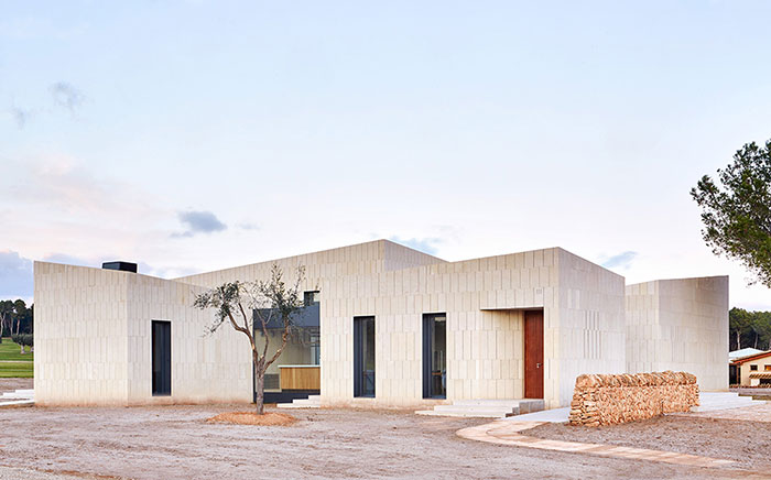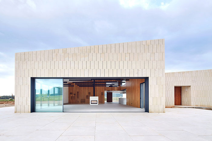 The materialization of the building maximizes the rock effect and echoes the local quarries of sand stone: the beauty of the natural stone cut is reflected in the façade; the Stone does cover just the facade, also the roof making no distinction between them: the roof is part of the facade and the facade is part of the roof. It is all about stone in the landscape.