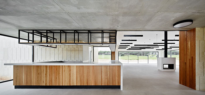 The regulation constrains gave the opportunity to explore different arrangements of the volumes and design the building in a way that it looked completely different from every angle: sometimes it looks small, or massive, or seems to extend into the landscape. It gives a very rich experience while playing the course as the building looks very different depending on the player's position.