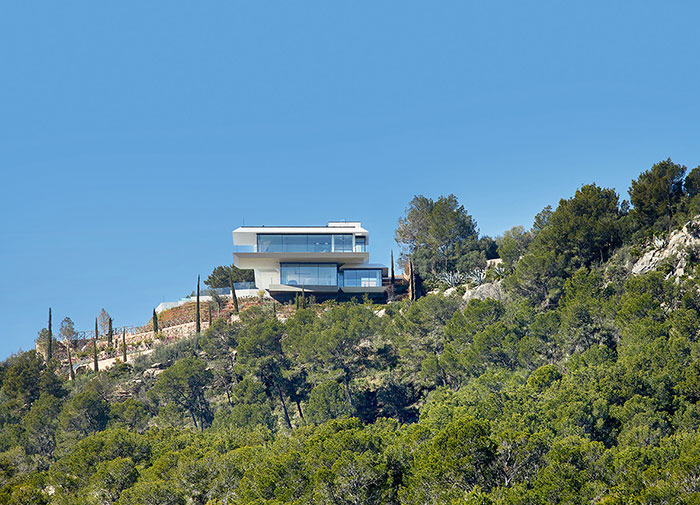 All about this project is the site: A hill top in Mallorca, an empty natural space offering dramatic topography and fabulous views. How to design a house in such a plot at the best possible location? The program defined by the client demanded maximization of the 360 º panoramic views whilst keeping privacy; is it possible to expose the house to the views and keep privacy? the design strategy projects the house out of the hill as much as possible; the house “flies out” of the mountain with a dramatic cantilever; by doing this operation, the house takes distance from the street, providing privacy, and opens to the views: the valley and the sea;