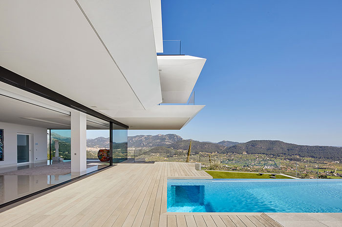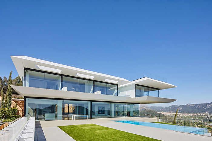 The choice of materials for the house reinforces the concept. The white krion coating at first floor provides lightness to the design, and not less important, less weight to the structure. Ground floor is mostly glass, both windows and façade, protected from the direct sun by the cantilever of the first floor. The windows with transparent sun protected glass and the façade with ventilated frosted glass. The basement is cladded in the same stone as the mountain so it merges with the rocks. The structure of the house is a big challenge. The concrete structure at the basement is the base for the steel structure of the rest of the house. The big cantilevers of the project, as already mentioned, protect from the direct sun, so does the design of the fins at first floor, all that combined with the position of the house at the top of the hill makes the house extremely efficient in summer, providing shade and cross ventilation. The house is also built with the highest sustainable standards: passive insulation, ventilated facades and full re usage of rain water and grey waters for irrigation purposes.