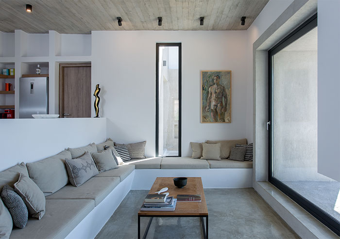 Apart from a point of cessation at the external envelope, the horizontal opening which is formed between the existing old structure and the new one, also develops a transparent zone, provides plenty of natural light for the space and creates visual evasions. In this way, it manages to frame the view of the horizon.