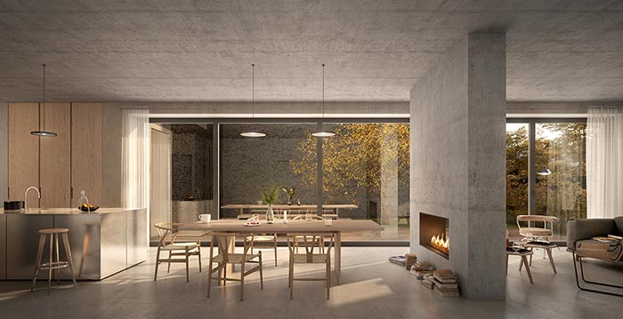 When entering a row house, the courtyard is directly visible through the hallway. To the left is the garage, and the kitchen on the right is open towards the living room. A free-standing, open fireplace splits the large open room in two, and large doors with windows face the atrium. There are three bedrooms and two terraces on the second floor.