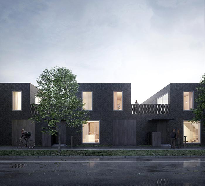 The Gustavslund row houses are situated on the edge of the city, where manmade structures beside the sea meet the open farmland of southern Sweden. The building’s massive shape provides much needed shelter from the strong winds. For the design of the row houses, inspiration was taken from the modernistically influenced, brick-building tradition of Helsingborg. And the design concept was modelled after an imagined cube of brick, from which blocks were removed until the final volume of the houses had been achieved. Dark brown brick laid on site dominate the exterior of the structure. Inside, a sheltered atrium courtyard has been provided for each dwelling. A special design feature are the brick railings, which consist of brick walls with every third brick removed - thus giving them a transparent and light expression. The southernmost terrace changes position, creating a rhythm to the building volume and offering a choice to the homeowners between a more western- or southern-facing terrace. Following the main terrace, there is a separate room that can be used as a studio or guest house.
