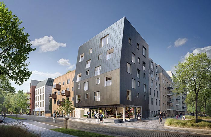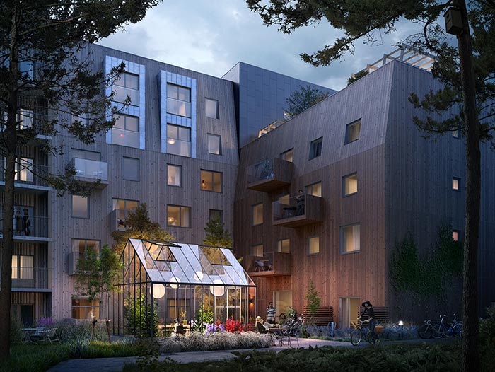 To create variety and at the same time a pleasant and permissive environment, we let three volumes, each with its own unique character, breaking down the large scale. Golden Palm, Black Birch and Silver Spruce are passive houses with wooden frames and facades, all with different treatments and details. The broken facades, sloping on the upper levels, reduce the perception of a tall volume while letting in more light. The façade inclination of 15° is also a way of optimizing the yield of the solar cells on Black Birch, especially during winter when the sun is low. The staggered volumes and a retracted ground floor provide an exciting, room creating yard and street environment which encourages residents and passers-by to stop and sit down.