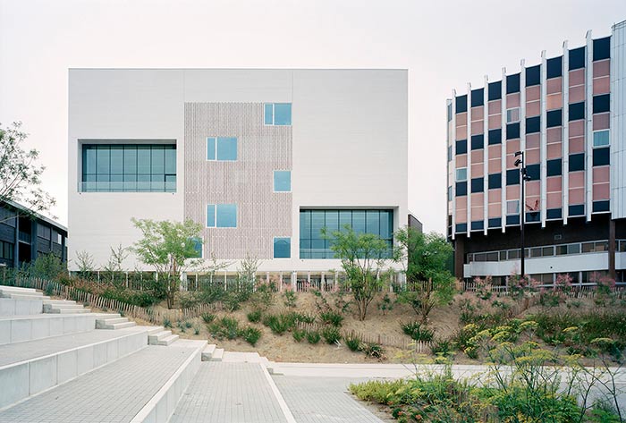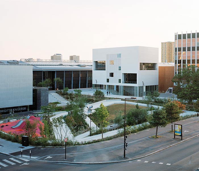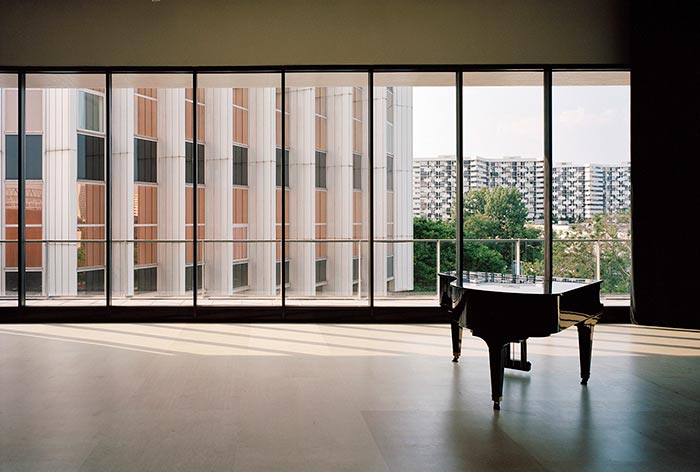 Located on the east side of the island of Nantes, the project combines the extension of the Conservatory and the Academy of performing arts. Shared and cross-disciplinary, the building sets up strong relations between the various practices and the city and takes part of the new cultural pole identity on the island. Music and dance studios are widely opened on the outside and offer the reciprocity of a contemporary relation between artistic culture and urban landscape.