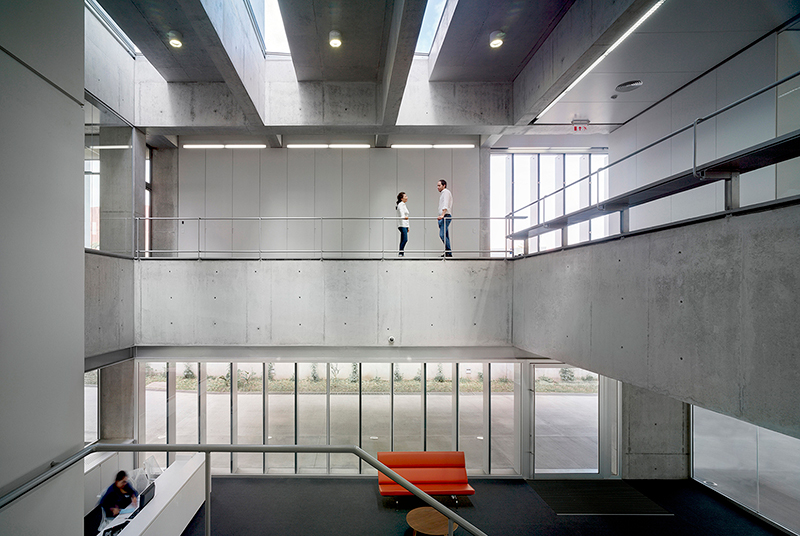 A vertical void connects both blocks at their intersection allowing visual relations between different levels and programs. Here, the light is vertical and comes from skylights on deck in contrast to the horizontal spatiality of the open office area located in the upper level.