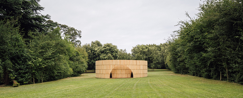 The circular pavilion features an abstract skin, a continuous facade across its curved surface, built on four levels of vertical wooden planks. Without assuming one main entrance, the outer façade, which may be entered from three different points, divides the entrance into the pavilion by its perimeter, thus fostering different accesses and relationships with Serralves gardens. Crossed by sunlight, the built structure projects over itself causing curved shadows that meander around the central façade, creating different shadow-drawings as the day passes by.