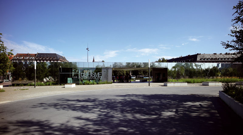 The ambition of this landmark is purposely expressed by a simple, uncluttered and « chic » volumetry. In such a context, characterized by massive and complex architectures, by dense urban planning, the choice of a sobre and elegant volume, the use of noble materials (stainless steel and wood) single out the center; Its distinctive design makes it easily recognizable. The stainless-steel cladding, which shapes the envelope of the building, was chosen for its aesthetic qualities of reflection. Spread across each facade, the material provides an abstraction of the building, in order to put the city and the tourist at the forefront ; it is the mirror of the city of Strasbourg, of the visitor... a kind of kinetic interweaving between architecture, landscape and human being.
