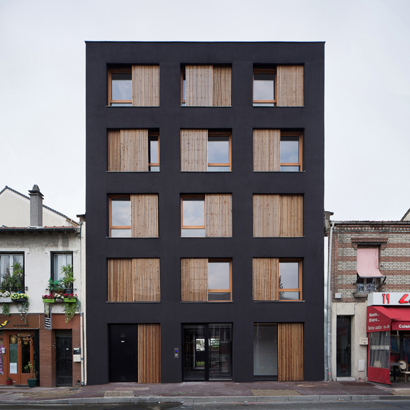 Facade materials are chosen for their simplicity of implementation and for their durability. The simplicity and the constructive rigor are read in frontage in the form of a frame repeating the structure posts / beams. The surfaces between this frame are then filled with wooden window, flaps with wooden battens and cladding of the same nature whose variation of layout animates the facade. Added to a simple and efficient volumetry, this treatment of windows gives the whole a precious character. A natural anthracite coating comes to dress the volume and guarantees the good aging of the whole.