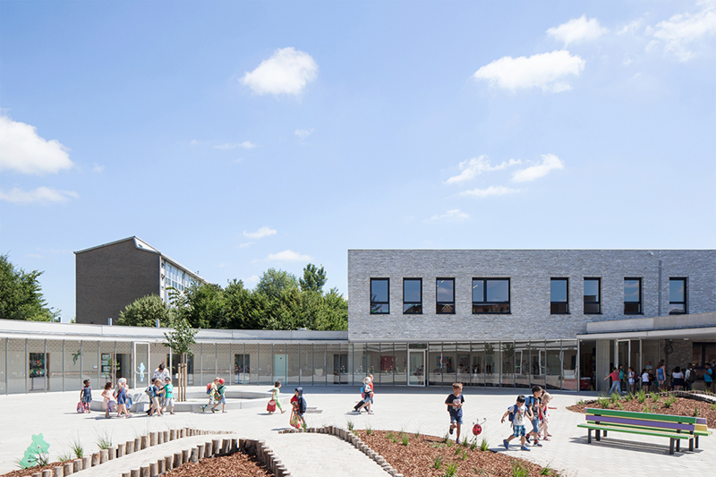 The specific volumetry of the building is the result of spatially organizing the experience of a child growing from toddler to young adult – two phases in life that demand a different approach. Although the school building is conceived as a whole, two zones can be perceived. Firstly, an embracing, enclosed and protective zone is created for the toddlers surrounded by classrooms. As they move on to primary school, they arrive in a more formal and rectangular volume that directs them to the wide world they soon will discover. The appearance makes the school blend with its surroundings. The organic low ring is the heart of the new green campus, while the volume of the primary school with its two floors relates to the surrounding existing buildings.