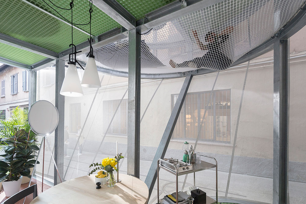 This house eschews a traditional organization with rooms dedicated to specific functions for a composition of a loose stack of porous realms. The incarnation for Salone del Mobile 2017 creates an attractive living area for up to three people on a previously unused 50-square-meter urban plot.
