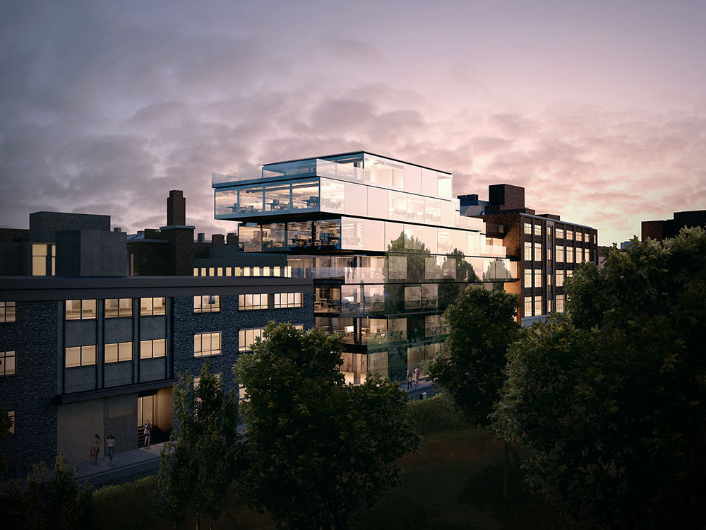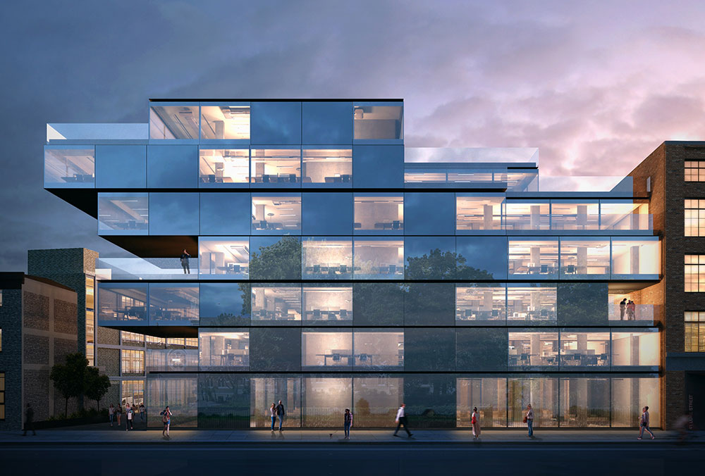 The abstract shape formed of dynamic shifting volumes presents a carefully considered and well-balanced composition. The façade is articulated through layered, reflective glazed panels on a regularised grid. Simplistic in appearance, the layering and subtle panel variations provide varying degrees of reflection whilst also offering interesting glimpses of the workspace behind. In daylight, the facade reads almost uniformly, but as daylight drops the façade starts to become animated in a more extrinsic composition.