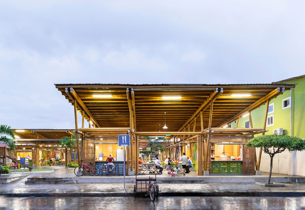 Due to the adjacent streets opening, two meeting and relaxation places are then produced: the multi-use entrance plaza and the playground. This playground is dedicated to the children of restaurant owners and the families of the visitors. It is a space of freshness by the presence of misted water and dense tropical vegetation.