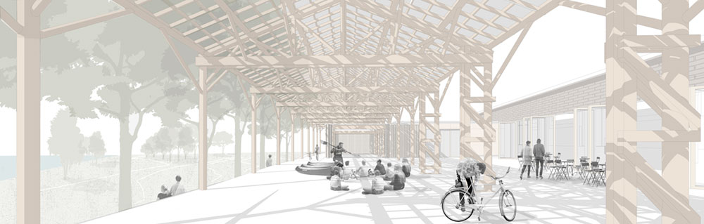 The restoration of the existing warehouses reveals the remains of a singular architecture with an industrial character: the concrete structure of one of the warehouses is visible at the restaurant; while, a wooden hole is preserved in order to house the canoe and bikes workshops as well as a section of the outdoor spaces.
