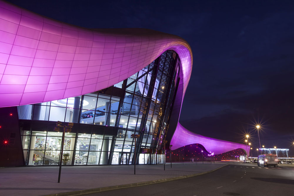 Krasnodar rolls-out the OZ Mall design concept of an iconic "wing" elevation floating over an arrow-shaped base. The feature-lit aluminum cladding provides a highly durable skin for the building suited to the Russian climate.