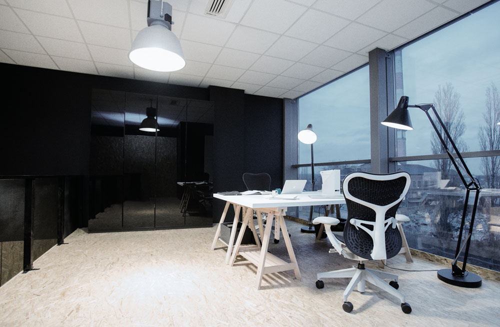 The walls are covered with OSBs painted black or colorless (manufactured without any harmful substances- no formaldehyde), highlighting compacted wood's harsh character. Closets for documents and micro kitchen arrangement are hidden behind natural OSBs door. We designed acoustic telephone booths for callers. There is a meeting room under the mezzanine.