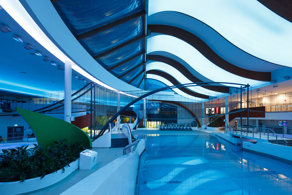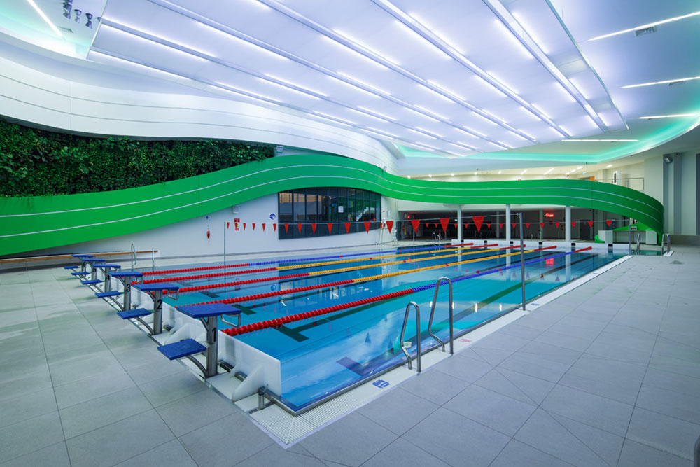 The complex works in synergy with a wastewater treatment plant serving as a bio-energy power plant HUB. Together they create energy for the Aquatic Center as well as for the city. The building produces twice as much energy as it consumes!