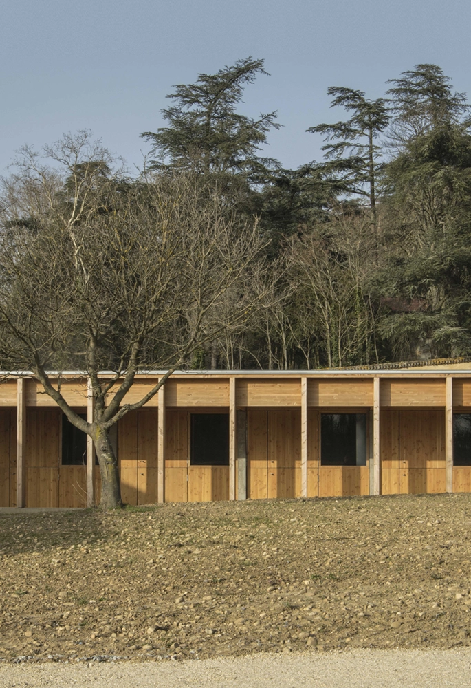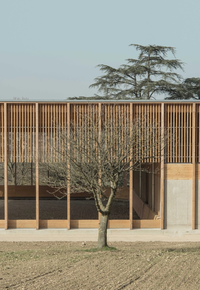 The project sits in the middle of nature, just a few kilometers away from Lyon. A natural landscape with exceptional qualities that the project sought to preserve and enhance through efficient design. The stables project reinterprets the traditional codes of agricultural architecture through a contemporary use of wood and concrete.