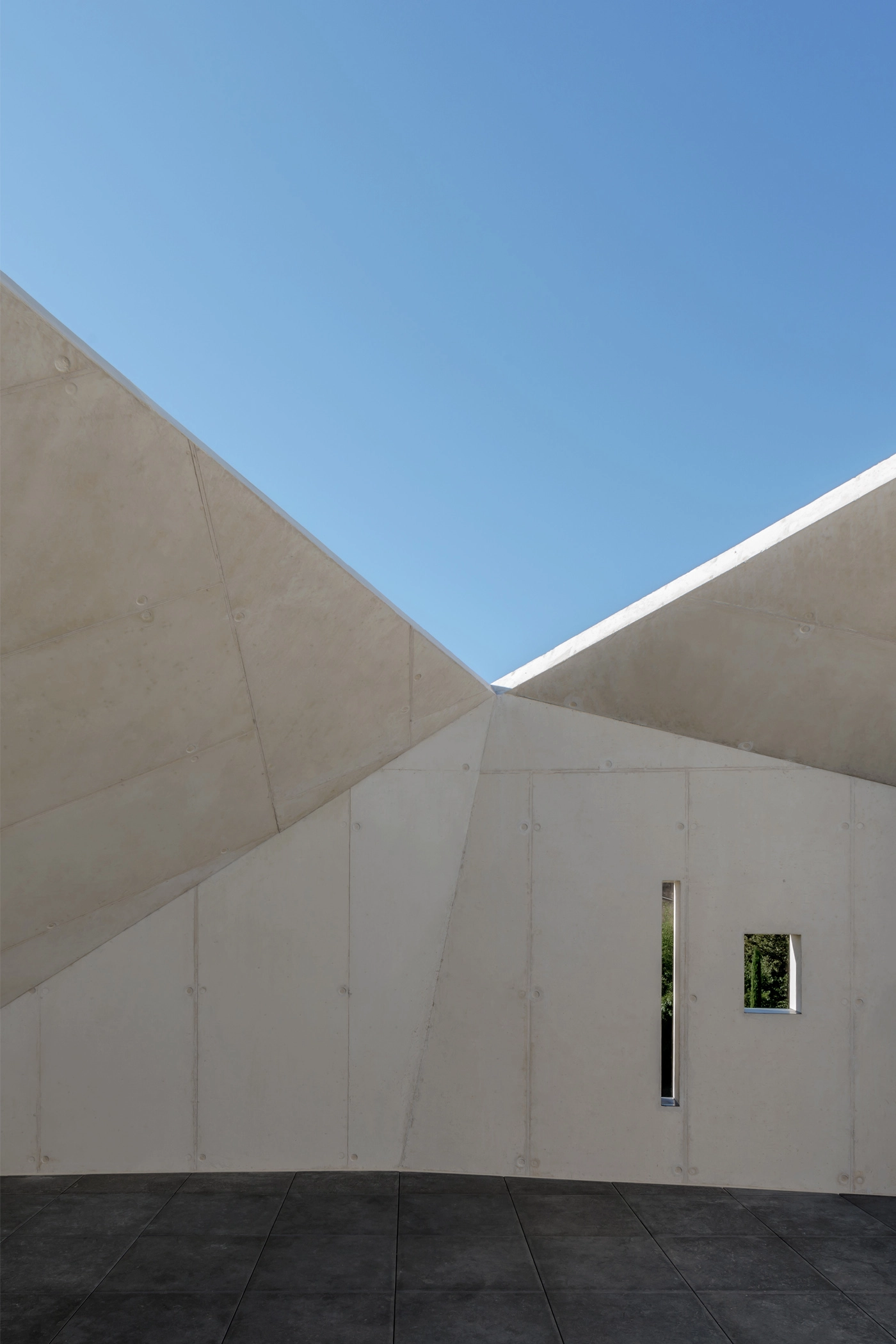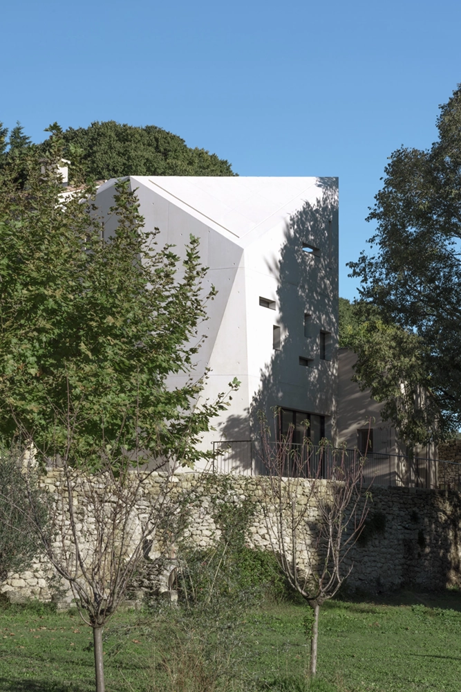 A monolithic and sculptural concrete volume rises from this landscape of greenery and limestone, resonating with the genie of this place, a former quarry.