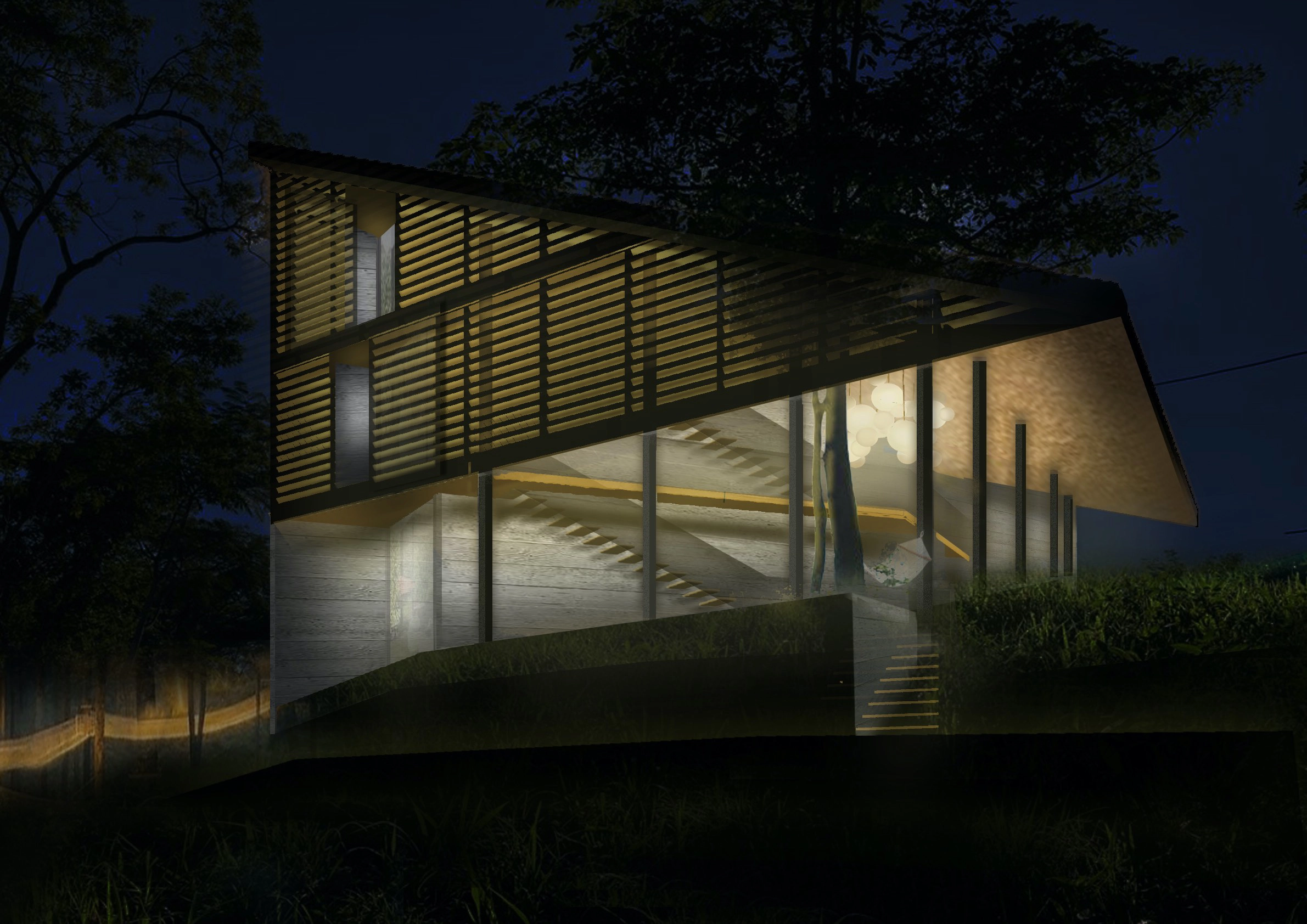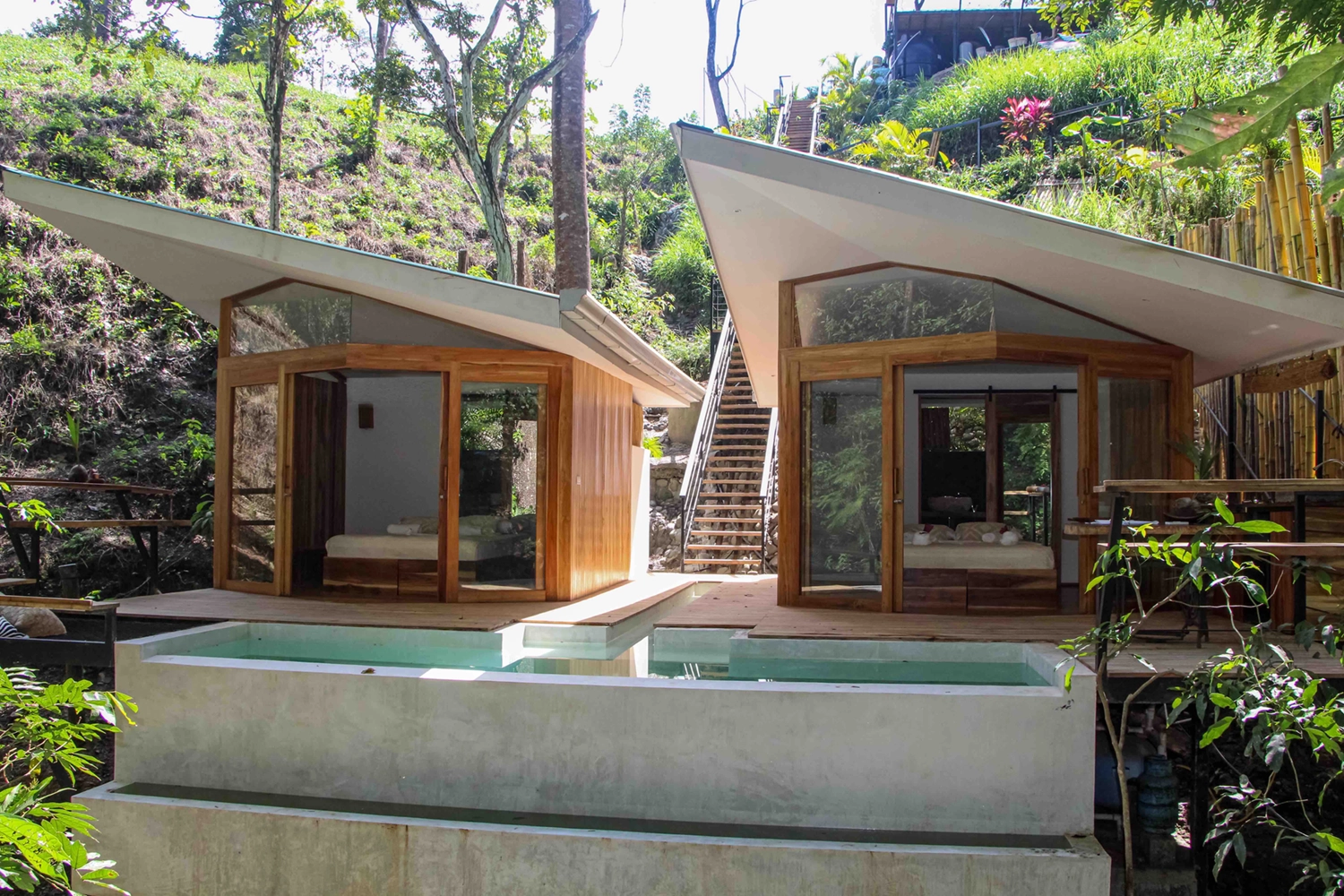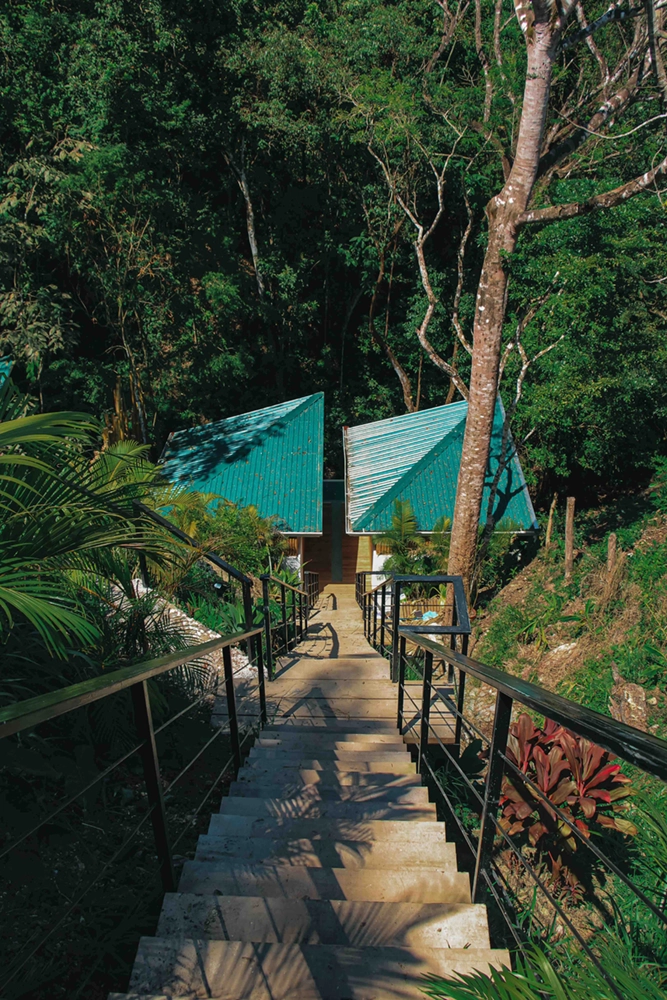 The Ecolodge consists of six small “casitas” overlooking the rainforest and a public villa perched at the top of the site dedicated to leisure, sport, and wellness. The villa and the “casitas” share a common architectural language and organization: interior and exterior porosities, large sheltering roof canopies and a bioclimatic design.