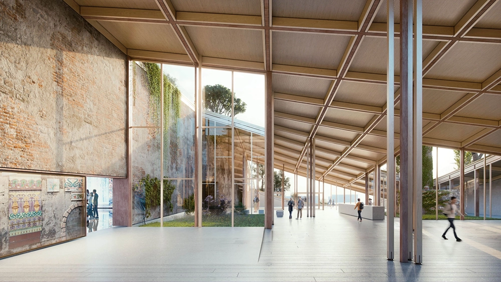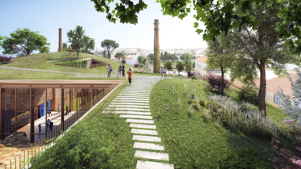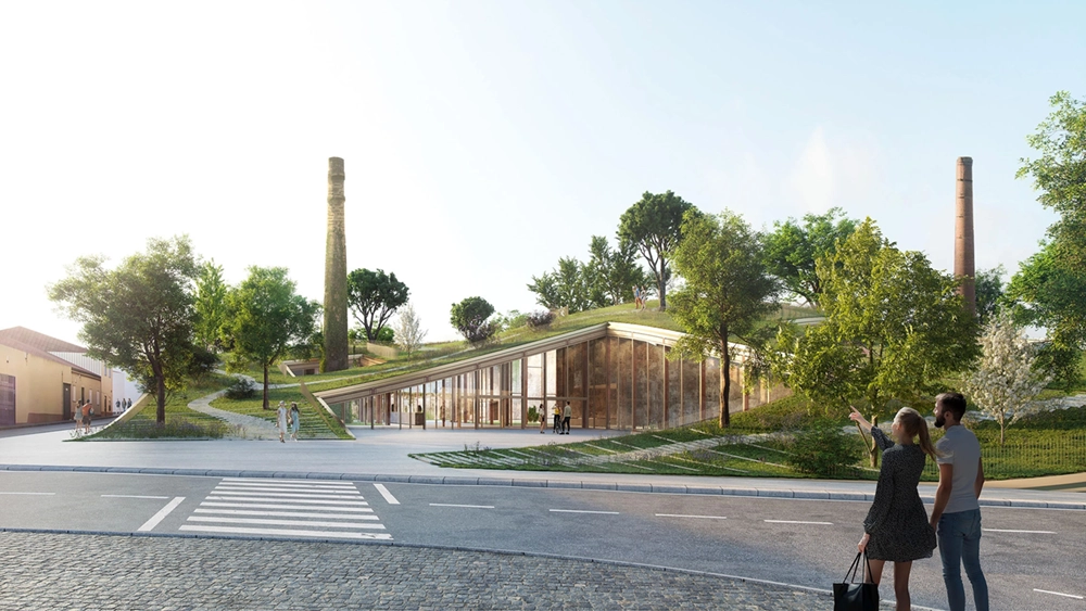 The proposal envisages a green veil being created over the entire plot, offering a qualified public space for the local community and the stage for the new museum. Throughout the park, one will find the reminiscences of the existing structures, monuments, and ruins of the old ceramic production halls. The topographic roof is perforated and partially allows light to come inside the museum. Simultaneously, it establishes a visual connection between the indoor and outdoor areas.