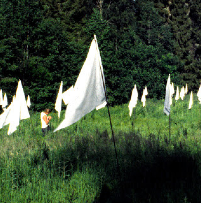In the summer of 2000, after collecting unwanted sheets from psychiatric hospitals around the country Casagrande & Rintala made 1;000 White Flags to punctuate the verdant landscape of one ski-slope as a gesture of surrender to insanity.