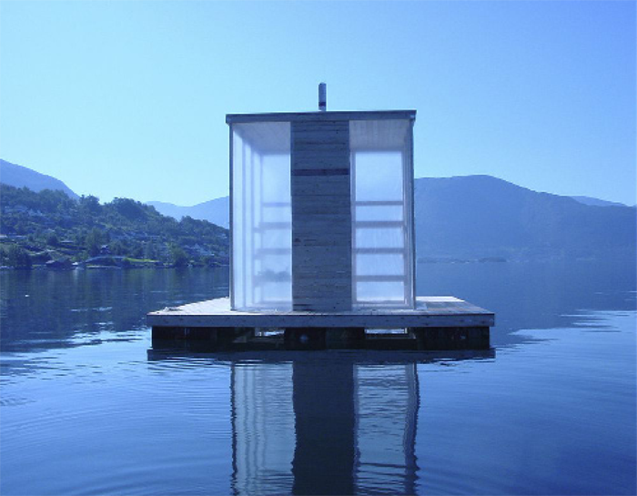 Anchored in the middle of the fjord, a level of privacy is maintained for bathers. Little winter daylight comes through transparent walls. At night sauna shines as a floating lantern. Access with rowing boat only. Descending swimming straight through the floor of water. Using any kind of soap is prohibited due to ecological reasons.