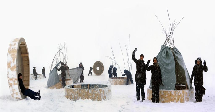 The 19 nationalities came together to create a mobile city for nomads that respect and are humbled by nature. The students were given a task to make a personal fishing shelter and collectively to build two communal focal points: a movable 'nomad sauna' on skies and an 'aurora observatory.