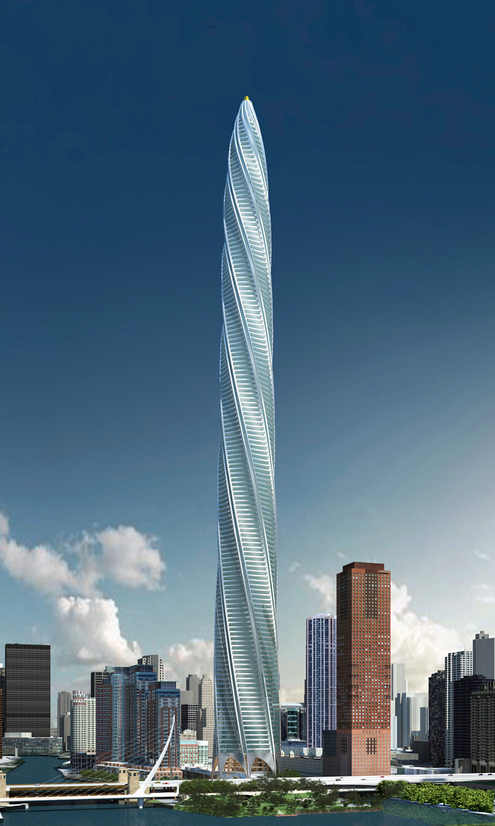 Proposed for a prominent 2.2-acre site on North Water Street, adjacent to Lake Shore Drive and near the entrance to Navy Pier, the Chicago Spire Tower will rise to a height of 1458 feet (444 meters) at its roof and approximately 2000 feet (610 meters) at the tip of its spire, making it the tallest building in the United States.