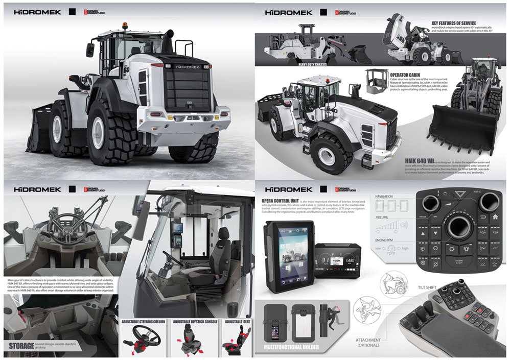 Designed by Hidromek Design Studio, the HMK 640 WL wheel loader represents the new product identity of Hidromek and goes beyond the current trends with its modern lines and bold appearance. It has been developed after a careful evaluation of operators’ demands and the extreme working conditions in mines and quarries. A mono-block engine hood offers better service and maintenance conditions. Its fully electronic joysticks with an adjustable console make the operation easier compared to similar vehicles. All settings and information can be displayed on an LED screen. The HMK 640 WL provides the best ergonomic and comfortable working environment with a cabin of ROPS and FOPS.
