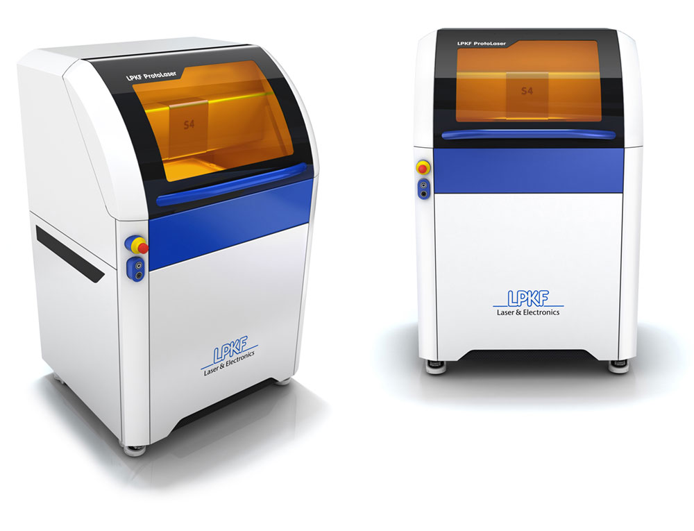 LPKF ProtoLasers are designed for PCB prototyping in the lab. The environmentally friendly laser replaces chemical etching and offers excellent precision. Thanks to the ergonomic design with its elegantly curved, space-saving vertical sliding front door, the user can either stand or sit while inspecting the prototyping process through the window (orange glass to filter the laser light). In keeping with CD specifications, the viewing area is framed in black, the work/grip areas are blue, the entire housing is white. Minimal, accurate splitlines equal the inner precision. The ProtoLaser use unmixed materials for easy recycling.