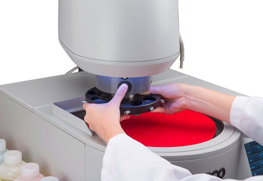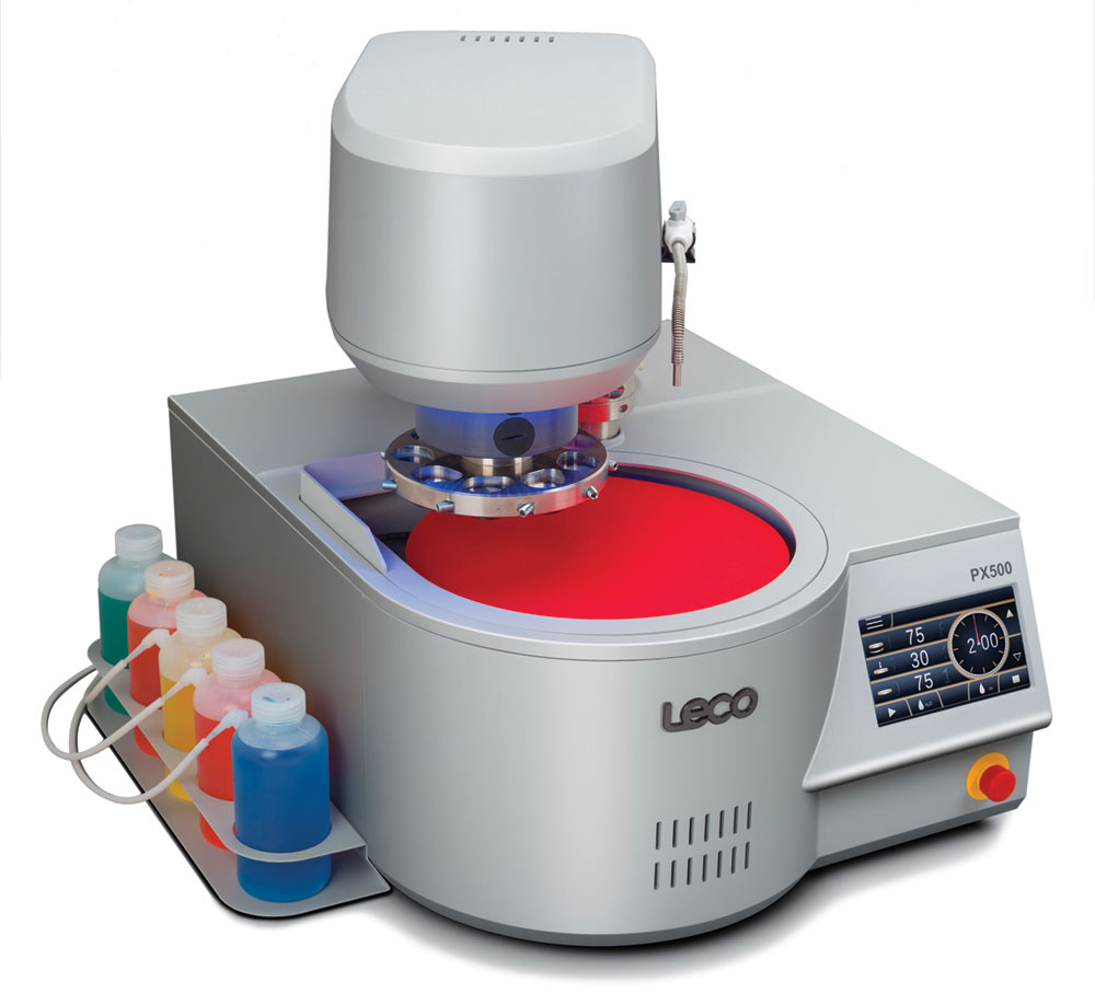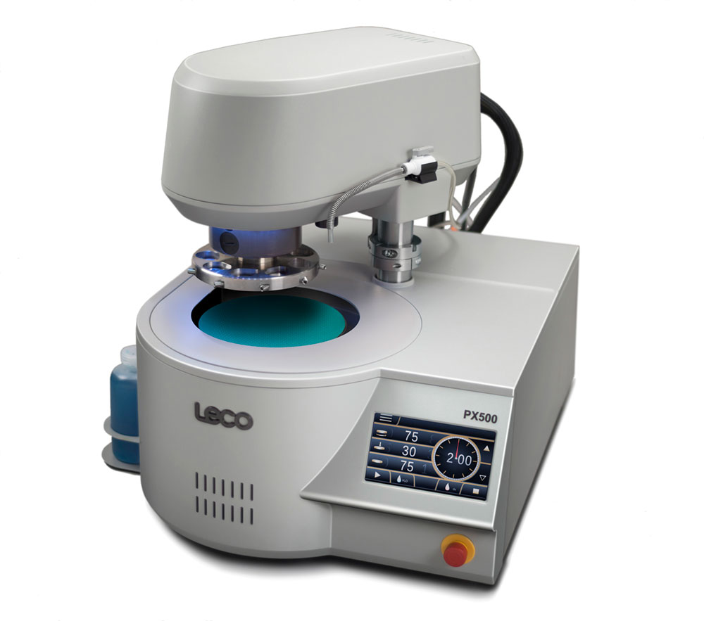 The Leco PX-500 is an advanced grinder/polisher for preparing test samples in the Metallographic Laboratory environment. It is designed to make the grinding process as user-friendly, clean, and precise as possible for the end-user. Features such as the computer-controlled grinding/polishing head, removable splash guard, ergonomically angled GUI, large touch screen, and automatic polishing solution dispenser, make it the most advanced grinder/polisher available. The large, easy-to-use touch LCD screen allows users to perfectly control and reproduce results from one sample to the next. All elements of the process are controlled through the touchscreen, including the grinding/polishing speed, pressure, lubrication solution and lubricant amount. Built-in LED lighting underneath the grinding/polishing head clearly illuminates the samples. The high-pressure water spigot is both user-positionable and removable, allowing lab technicians to lubricate and clean samples exactly as desired. In addition, the automatic-flush spiral bowl drain ensures effortless clean-up. The cost to produce the PX-500 has also been significantly reduced compared to previous products in the same line. This was achieved through injection molding engineering plastic parts to replace what were formerly expensive die-cast aluminum parts. The new PX-500 is designed inside and out to be the best grinder/polisher for the skilled workers, technicians, and scientists who build and use them on a daily basis.