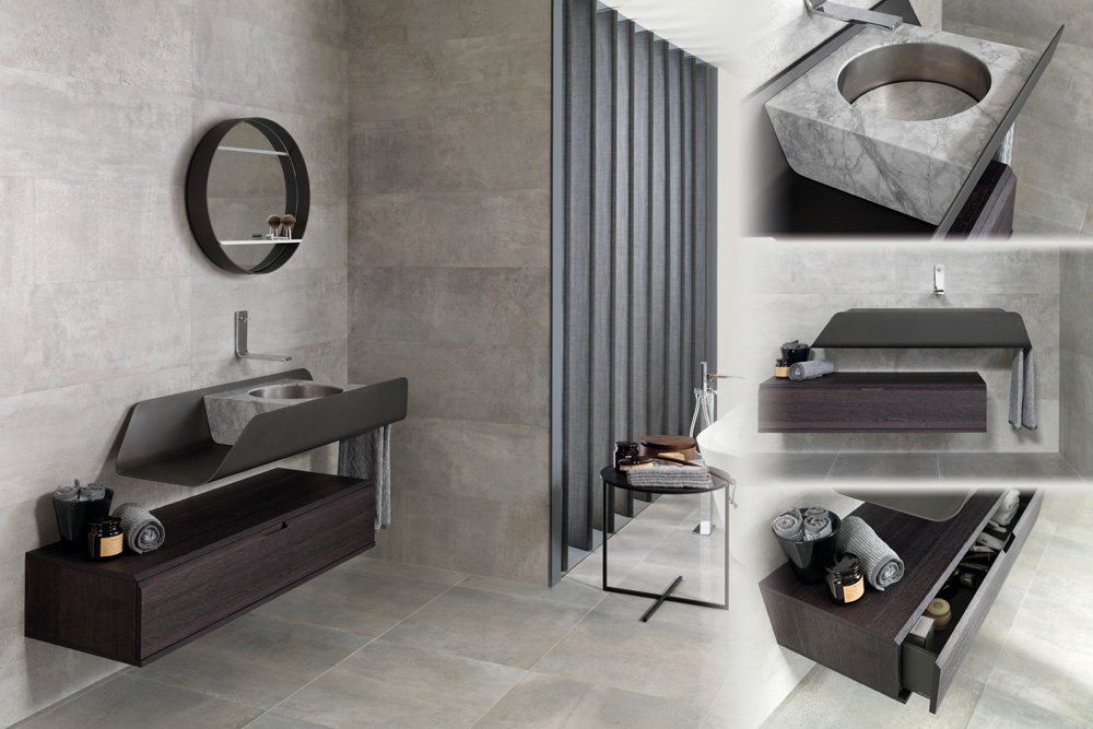 Duna bathroom furniture by Gamadecor shows us how the bathroom of the future will be designed, through its unique shape and pioneering spirit. It amazes because of its elegant combination of materials which conveys authenticity in a contemporary style. Specifically, Duna furniture consists of a channel-shaped aluminium sheet where a natural granite basin manufactured with Folding technology is installed, and it is fitted in the inside gap of the curved sheet so that the material vein is provided with continuity. Regarding the finishes, it is available in a superficial black lacquered epoxy paint and Portobello granite.