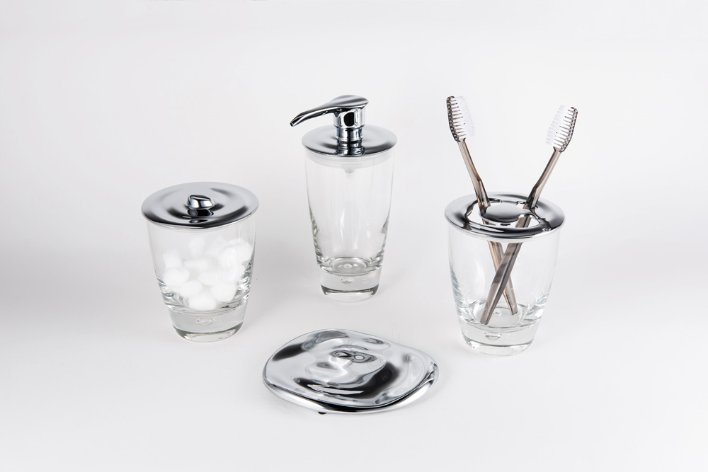 Ether Freestanding Bathroom Accessory Set has been inspired by the image of aurora, designer tried to represent it with curved surface, polished chrome plating finish, and transparent containers for bringing the fantastic refraction of bathroom lightings.