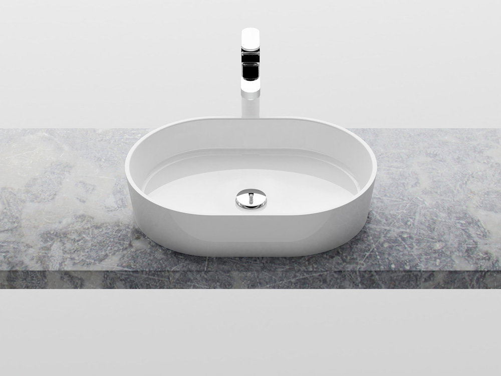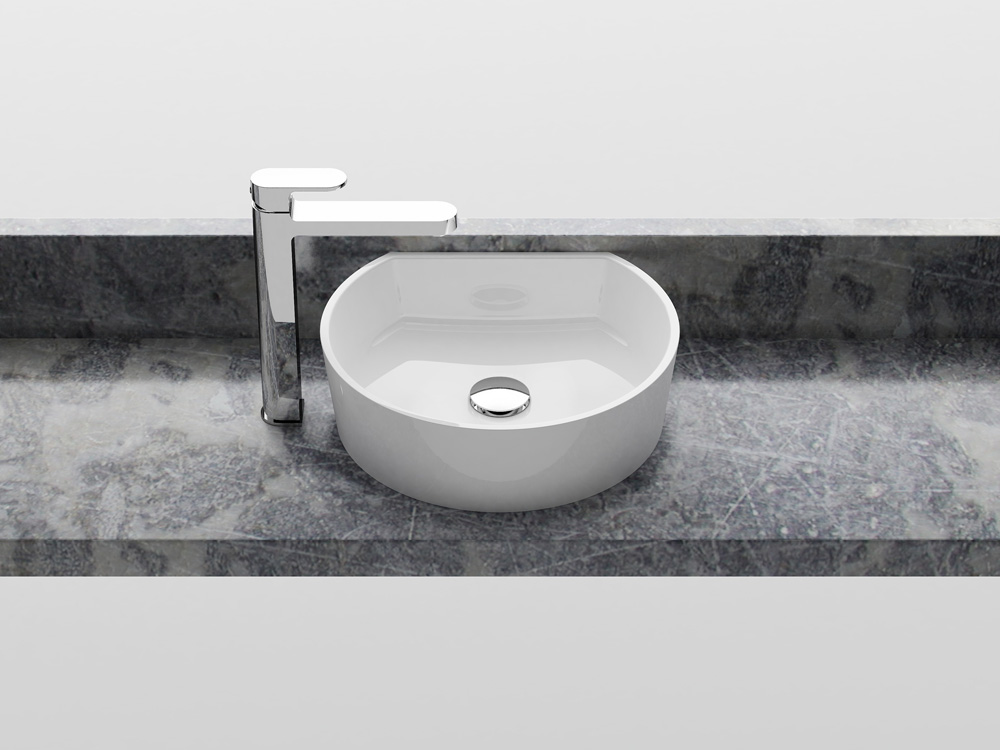 A set of five washbasins made from cultured marble. These basins are based on the elementary geometric shape of a circle and its variations. The set includes the basic circular model Moon 1, which was partly cut off to create Moon 1C (the basin can be fitted to a wall). Moon 2 has an oval shape, while the oval basin with a storage shelf is called Moon 2S (shelf). Moon 3 is an irregularly shaped basin. The resulting delicate-looking washbasins follow the basic geometric shape of a circle to reflect the current trend of slender forms and provide their users with exceptional freedom when furnishing their interiors.