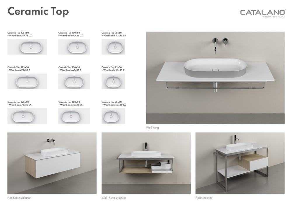 Catalano Ceramic Top allows a direct installation to the wall, without supporting frames and can be integrated with a single-drawer cabinet, an aluminum structure (floor-mounted or wall-hung) or with a towel rail. Three sizes available: 50x75 cm, 50x100 cm and 50x125 cm.