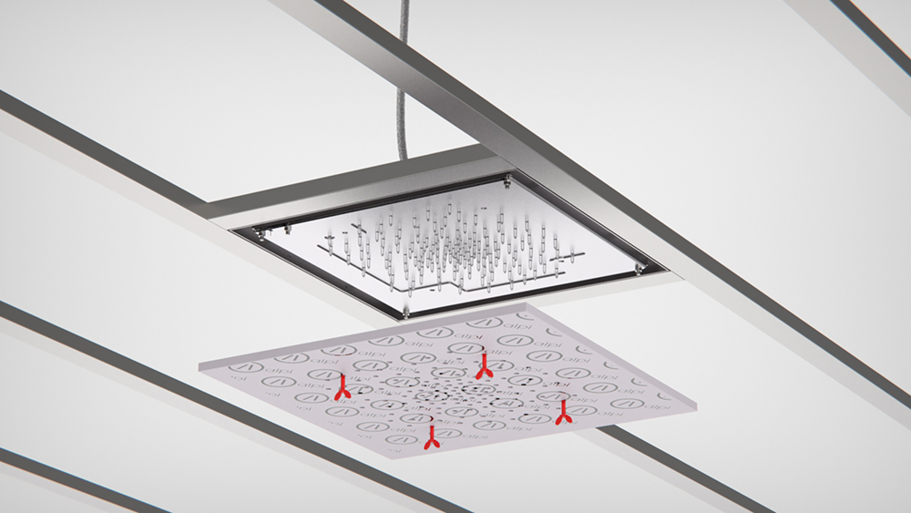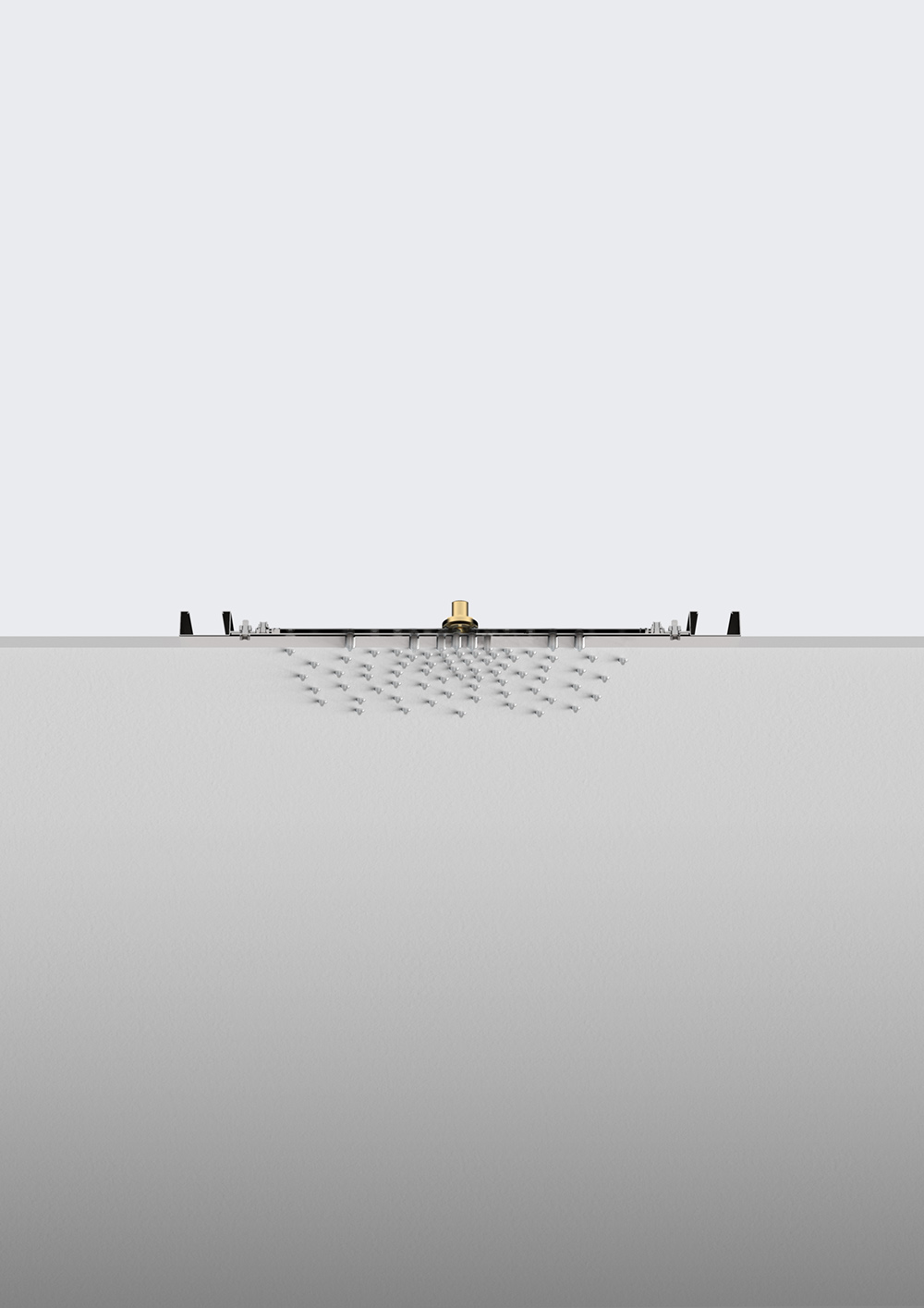 The FADE system provides a shower head that has to be mounted into the plasterboard structure during the false ceiling assembly. After the ceiling has been plastered and painted and every sign has disappeared, by activating four simple butterfly screws the silicone nozzles go down through the holes on the assembled panel and as a final result the nozzles come out from the ceiling without any other exposed part.