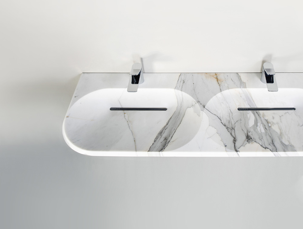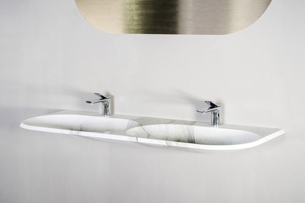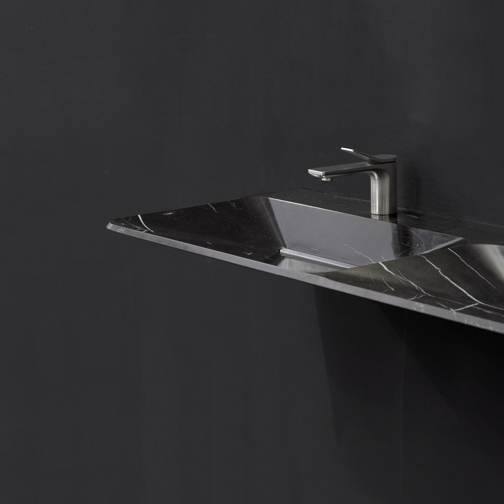 Mutsch’s experience in marlbe processing enabled made it possible to push the CNC milling technology to an absolute limit by reducing the material thickness down to a minimum. The result is an ultra slim basin without any visible syphon on the bottom side.