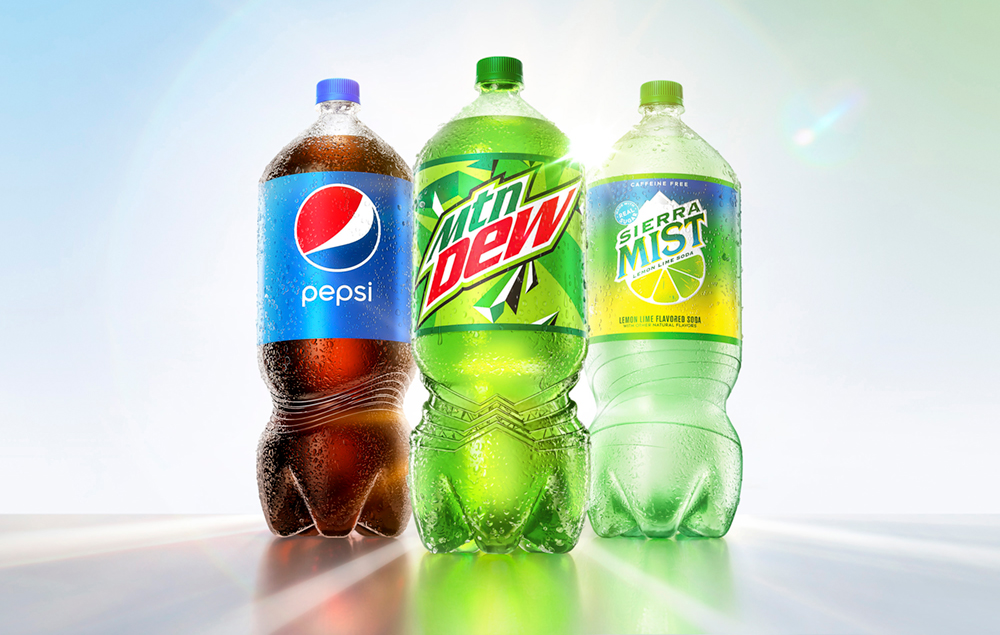 The new bottle is designed with consumers in mind. We gave them an easier, more manageable pour, while designing a look that stands out on shelf, at a BBQ and everywhere in between. Flagship portfolio products – including Pepsi 2L, and Mtn Dew 2L – feature unique designs on their bottle grip point. These textural elements help with grip and are subtle nods to each soda’s legacy branding. The rest of the portfolio will have a uniform striking design at the grip point, meant to stand out visually while maximizing form and function. The labels are higher on the bottle for better billboarding on shelf. And these labels use 24% less plastic** than their predecessor. ** Manta 2L labels compared against existing, Straight Wall 2L labels