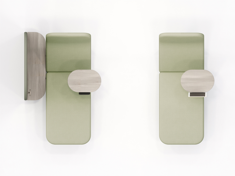 The privacy screen, covered in 3D knit upholstery, creates a personal workspace furnished with a coat hook and side table, perfect for storing your bag or holding that important cup of coffee while you work.